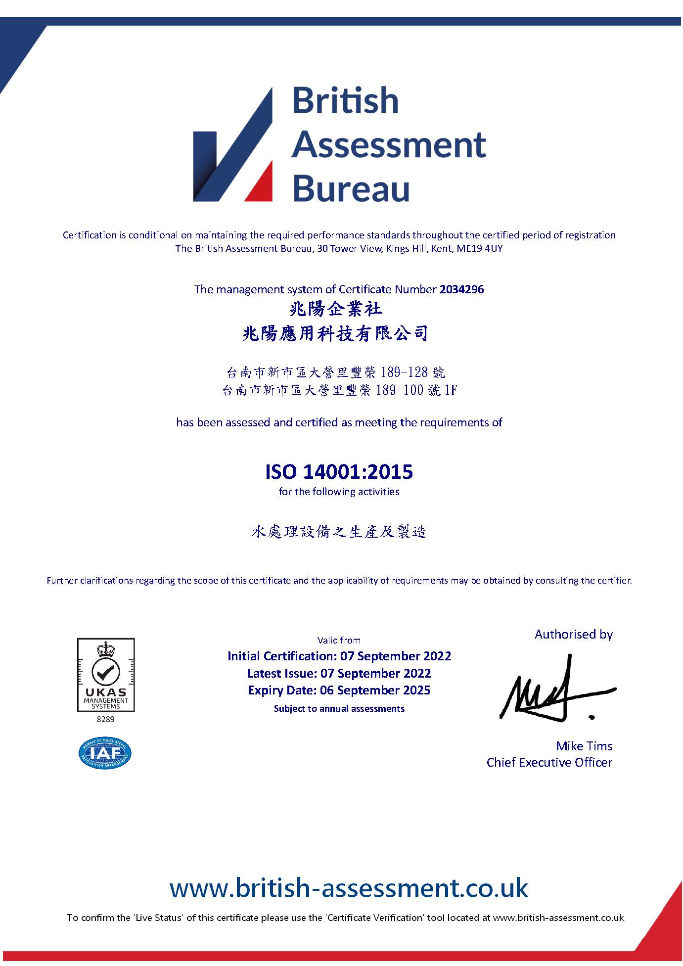 2016年起,兆陽開始研發UV+O3智能複合水處理裝置。2018年,正式取得UV+O3智能複合水處理裝置專利認證,並將該設備導入Innolux、AUO、深超、華星等國內外各大光電廠。目前在台灣地區UV+O3智能複合水處理裝置的市佔率超過55%,在Innolux已有超過170台的實績。